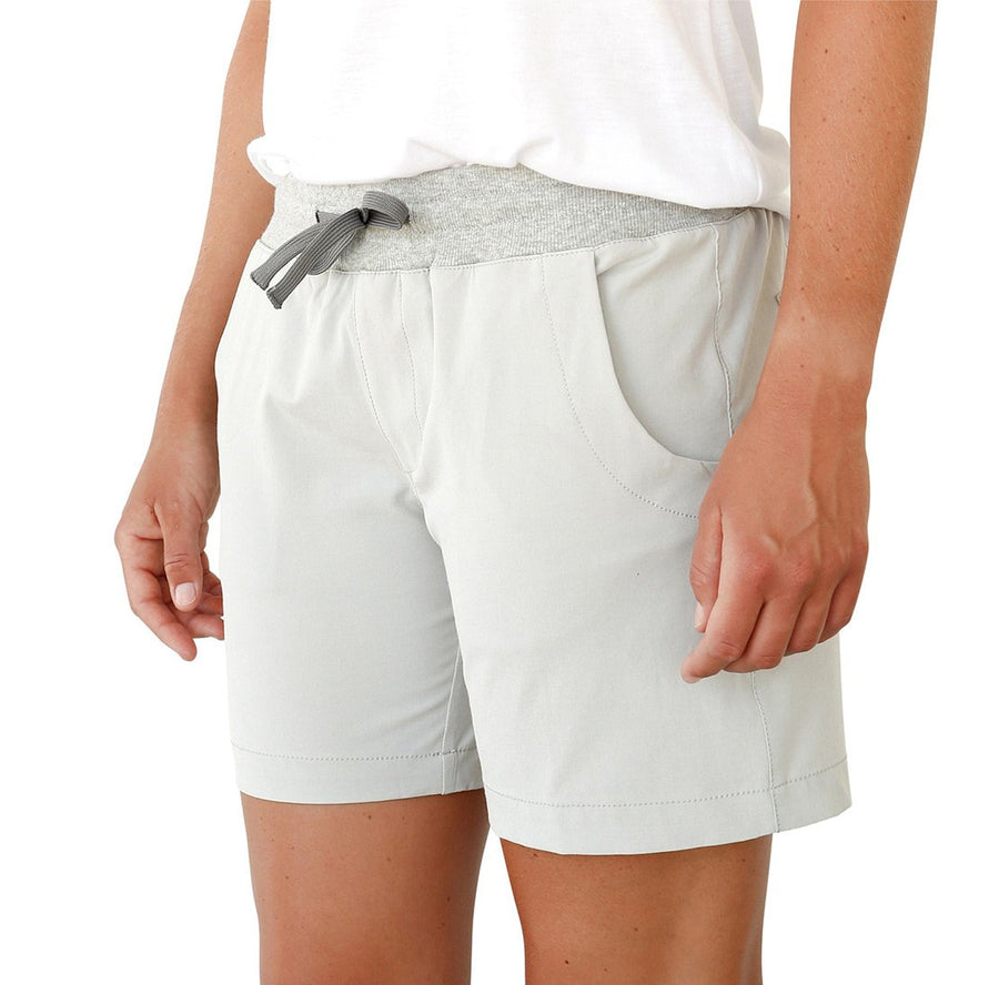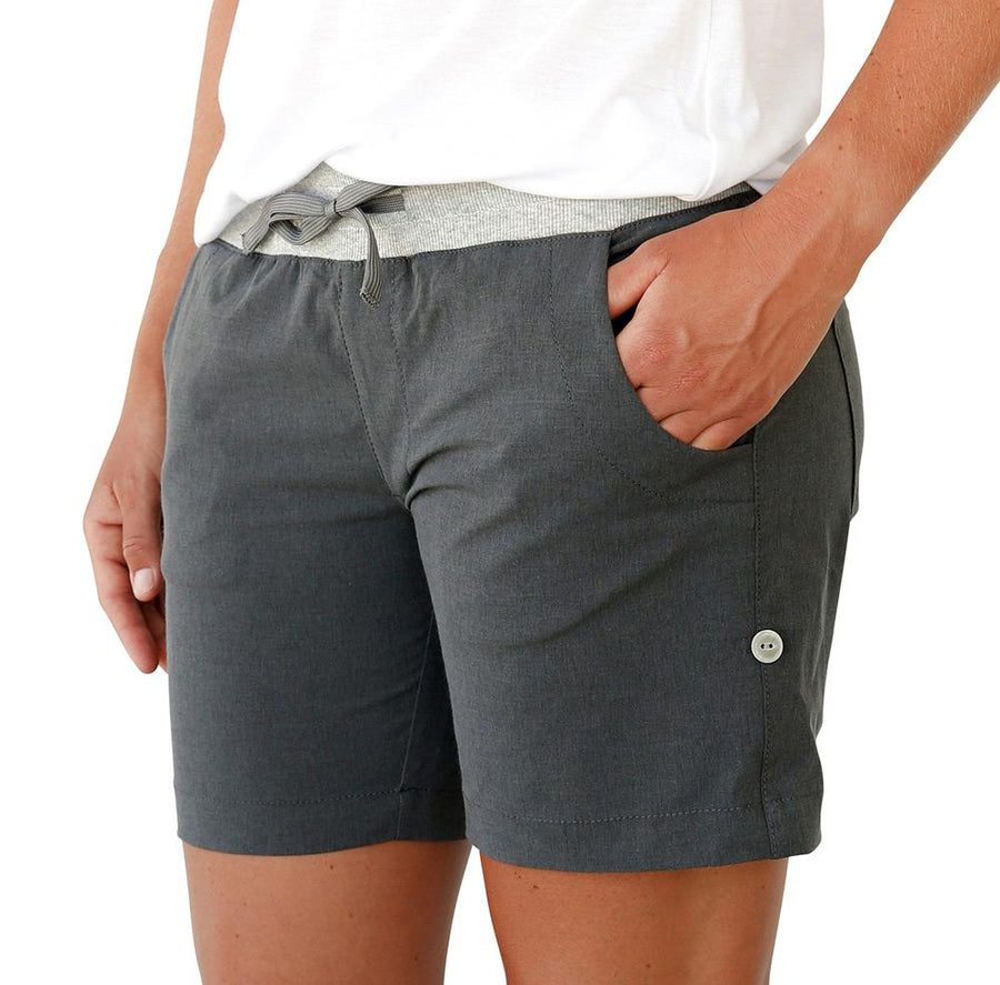 4 way stretch linen texture short with grey heather knit rib waistband with drawcord. Epaulets at sides of legs so you can roll to make shorter or keep at a longer length. Zip coin pocket at left hip. Tonal Linksoul womens embroidery at right back pocket. Elastic at leg opening.
