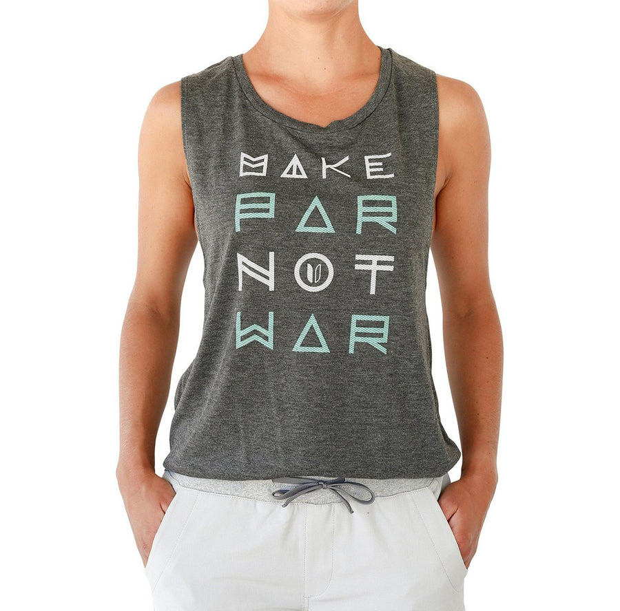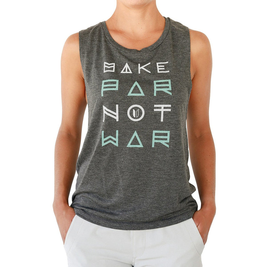 Extra comfortable and drapey feminine muscle tank. Low cut armhole. Make Par Not War graphic at front.